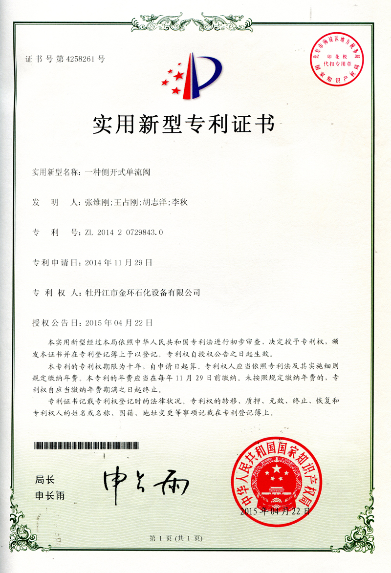 一種側(cè)開式單流閥實用新型專利證書ZL 2014 2 0729843.0